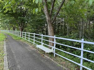 ガードレールに支持された木製のベンチ。 テコの原理を基づく片持ち形式の固定ディテールは明らかに後付けされたもの。 誰かが日曜大工の延長で据え付けたのだろう。 共色の塗装によって違和なく納まり、そして背後の緑と鮮やかな対比を成す作者不明の風景。
