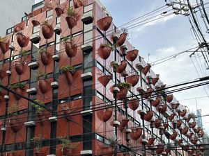 その設置目的は、暑熱緩和よりも個性的な外観の獲得が主。 未だ気候変動や災害激甚化が顕然化しておらず、そして異化のための意匠が付加価値として強く求められていた時代の平和な壁面緑化。