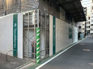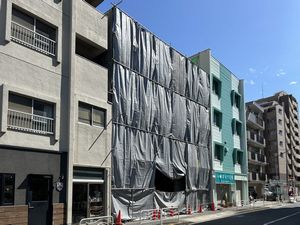 解体工事のために仮設足場に張られた防音シートが深いドレープを纏い、光沢のある表装に日差しが陰翳を刻む。