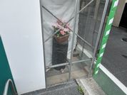 建設現場の仮囲いの隅角部に透明のパネルを用いる目的は、出会い頭の衝突リスクを低減するための視野確保。 その内側に、現場で発生した廃材を用いて飾り棚を設け、造花を添える。
