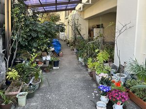 コンクリート舗装で固められた路地に並ぶ夥しい量の鉢植えが織り成す都市緑化。